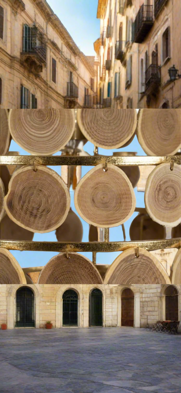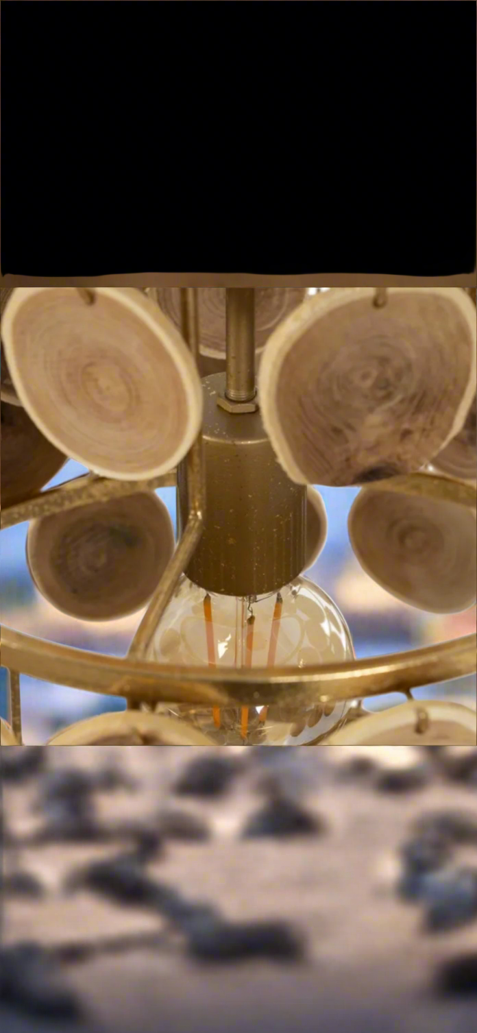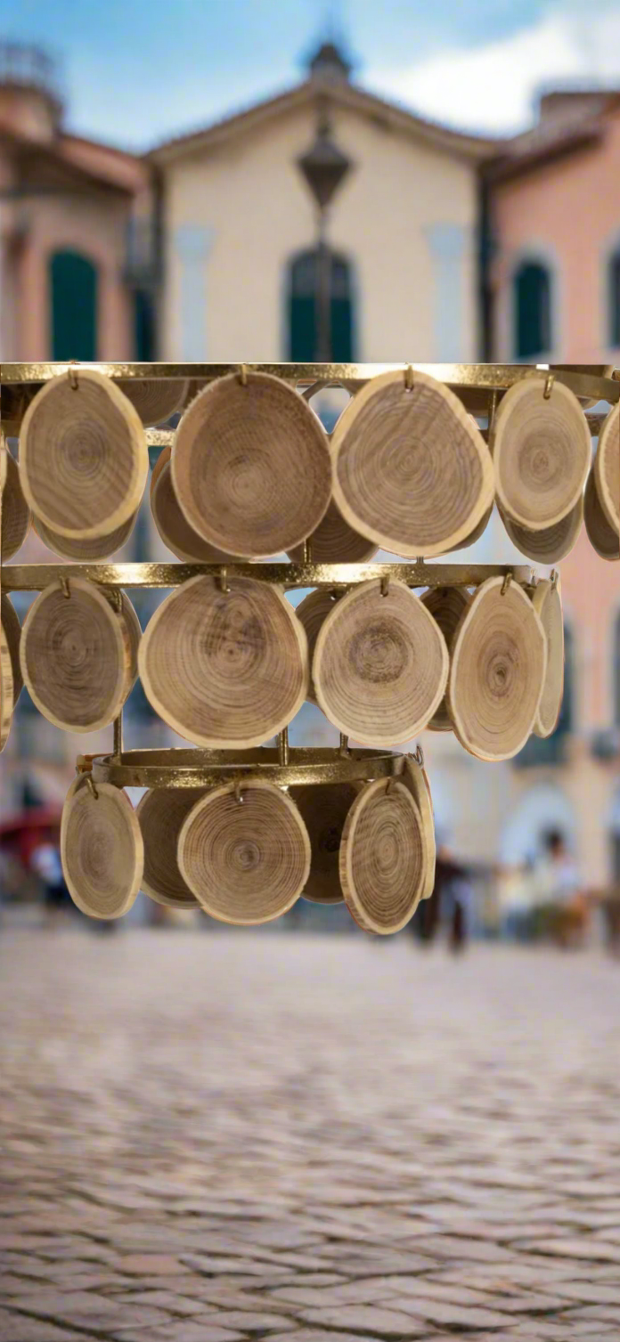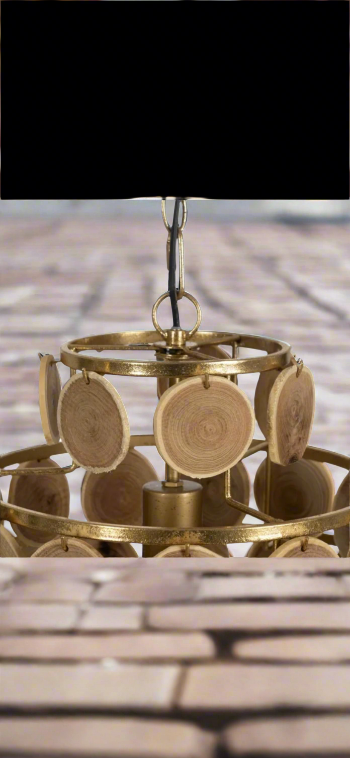 Lampadario unico con lavorazione semiartigianale in tozzi di legno di abete e metallo verniciato oro. Modello lavoratissimo, particolarmente delicato di misura : 45 dm. x 45 dm. x 59 h. - L'originalita' è assolutamente innegabile, creazione per amatori dal gusto forte e particolare ! Solo su prenotazione, in arrivo per i primi 10 giorni di Ottobre 2025.